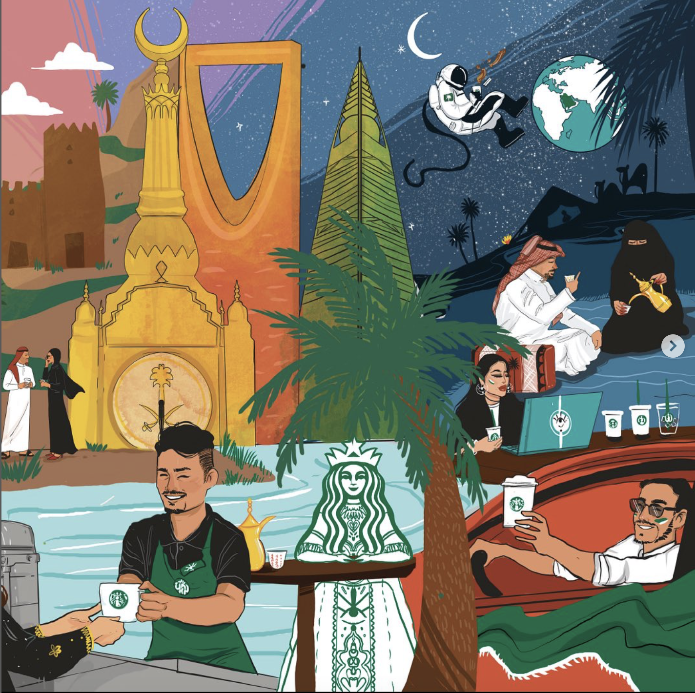 In this collaboration with Starbucks, a large painting was created at one of the Starbucks branches in Jeddah to commemorate the National Day. The painting reflects various elements associated with coffee in the past and its current usage, while also featuring some Saudi landmarks that showcase the beauty of Saudi Arabia.